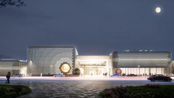 Объект, оформленный геометрическим паттерном из треугольников, возведут возле пруда.