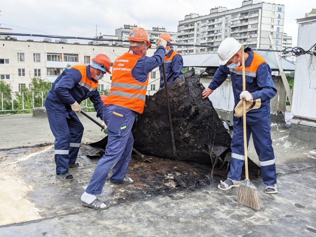 На крышу нас не пустили. «Извините, по технике безопасности не положено», - говорит Сергей Попов. Вместе с тем он подробно рассказал о выполняемых кровельных работах. «Снимаем старое покрытие, все вскрываем, зачищаем. Потом в два слоя накатывается новый ковер. Все будет герметично. Первый слой гидроизоляционный, а второй – это так называемая бронь. Она не боится механических повреждений, ультрафиолетовых лучей, - поясняет Сергей Попов. - Ремонтируем участками. Сколько вскрыли за один раз, столько закатали. Чтобы не затопило жителей в случае, если пойдет дождь».