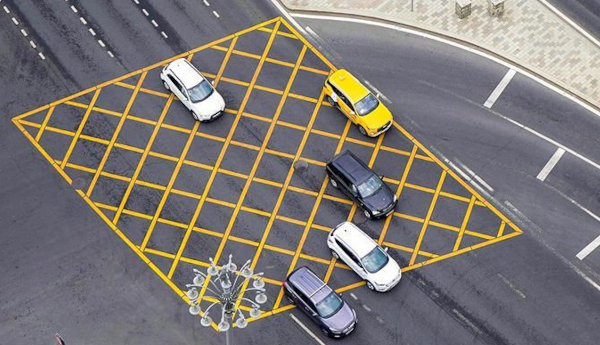 Вафельная разметка представляет собой ярко-желтую сетку из диагональных линий в центре перекрестка. Если возник затор, выезжать на нее нельзя.