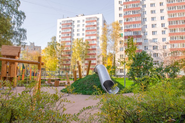 На улице Академика Скрябина в Кузьминках жители двора просили учесть неровный рельеф участка. В итоге специалисты перенесли спортивную коробку, а на естественном холме установили детскую площадку с навесами и скамейками для взрослых. Обустроили кольцевой маршрут для прогулок, катания на велосипеде и пробежек. В итоге перепад высот в 3 метра использовали так, что он стал полноценно частью игровой зоны. В тексте отмечается, что всего здесь было установлено около 80 малых архитектурных форм, высадили дополнительно более 40 кустарников и деревьев. Общая площадь благоустройства составила 1,03 Га.